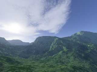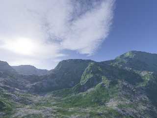 eine zerklüftete Oberfläche besonders sichtbar, und die ganze Oberfläche sieht schroff aus. Für unser Gras lassen wir die Einstellungen auf den Standardwerten. Im unteren Bereich können zwei verschiedene Arten von Einstellungen gemacht werden, die bestimmen, wo der Layer sichtbar wird. 1.) Altitude Contraints Hier kann festgelegt werden, in welchen Höhen der Layer aktiv ist. Es kann eine maximale und minimale Höhe festgelegt werden. Der Balken links zeigt den ausgewählten Höhenbereich weiß an. Um eine Einstellung für die maximale Höhe ('Max altitude') oder die minimale Höhe ('Min altitude') zu machen müßen Sie einen Haken in die Checkbox davor machen, und dann einen Wert in das Feld daneben eingeben. Über den Regler, der jeweils rechts daneben steht können Sie zwischen 'sharp' und 'fuzzy' unterscheiden. Sie legen also fest, ob die getroffene Einstellung ganz streng beachtet werden soll (sharp), oder ob Abweichungen davon geben darf (fuzzy). Wir wählen eine Max Altitude von 10, denn auf den bergen soll es kein dunkelgrün mehr geben, das Gras dort erscheint nämlich durch den Sonnenschein heller. Den Regler stellen wir etwas weiter nach links in Richtung sharp. 2.) Slope Contraints Hier läßt sich bestimmen, bei welchen Steigungsverhältnissen der Layer auftreten soll. Die Einstellungen gleichen den vorhergehenden. Wir legen hier einen Wert für 'Max slope' fest, denn an steilen Hängen wächst ja kein Gras. Eine 'Min slope' Einstellung ist nicht notwendig, denn in der Ebene soll es ja überall Gras geben. Die Werte werden hier nicht direkt eingegeben, sondern über einen Regler eingestellt. Wir sind jetzt mit den einstellungen für das erste Kind fertig, und können das Fenster schließen. Nun bleibt noch das zweite Kind. Wir klicken es an und wählen dann Edit. Wir nennen es Hellgrün und stellen eine hellgrüne Frabe mit den Werte Red 41, Green 60 und Blue 29 ein. In der Advanced Distribution stellen wir dann eine Min Altitude von '-10' ein, und eine kleine Min Slope (etwa 1/4 auf dem Regler von rechts aus gesehen). Da es nun möglicherweise fast kein weiß auf der Vorschau, also kein Hellgrün in der Landschaft, mehr gibt, müssen die Werte für Coverage und Fractal Noise erhöht werden. Nun können wir ein erstes Test-Bild rendern. ![]() Wir sehen bereits eine Gras-bewachsene Landschaft. Aber es fehlt noch etwas, nämlich der Fels. Die steilen Hänge sollten normalerweise nicht Grasbewachsen sein, das sieht unrealistisch aus. Deshalb erzeugen wir einen Layer für den Fels. Dazu klicken wir auf den Layer Gras in unserer Liste, denn dieses ist die höchtse Ebene, auf der wir ja auch den Fels-Layer haben möchten. Dann klicken wir auf den Button Add Child. Unterhalb von Hellgrün steht nun [New Surface] in unsere Liste. Wir wählen diesen neuen Eintrag durch anklicken aus und erzeugen über den Button Add Child noch zwei neue Kinder zu diesem neuen Layer. Vor [New Surface] steht jetzt ein '+', wenn wir es anklicken sehen wir die beiden Kinder, die in der Struktur unterhalb unseres ersten neuen Layers stehen. Das werden später verschiedene Farbausprägungen des Felsen. Wir beginnen nun mit den Einstellungen für den Fels-Layer, also dem ersten [New Surface] Eintrag in der Liste. Wir wählen ihn aus und klicken auf Edit. Dieser Layer bekommt die Farbkombination Rot 64, Grün 64, Blau 56 und den Namen Fels. Dieser Fels wird überall sichtbar sein, und so den Eindruck einer felsigen Landschaft erzeugen, auf der nur stellenweise Gras wächst. Wir wollen uns nun auch die Einstellungsmöglichkeiten neben der runden Vorschau etwas näher anschauen. Dort findet sich als erstes der Regler 'Bumpiness'. Er bestimmt, wie zerklüftet die Oberflächentextur ist. Je weiter rechts er steht, desto unebener ist die Oberfläche hinterher. Wenn dieser Regler sehr weit rechts steht, dann kann die Oberfläche sogar so uneben sein, daß die ursprüngliche Struktur des Terrains nicht mehr so stark zu erkennen ist. Um das zu Regeln gibt es die Einstellung 'Mimic Terrain'. Je weiter dieser Regler rechts steht, desto stärker passt sich die Oberfläche der Struktur des Terrains an. Rechts daneben gibt es noch einen Button 'Reset Bumps'. Dieser führt NICHT dazu, daß die Einstellungen Bumpiness und Mimic Terrain verändert werden, sondern er erzeugt lediglich eine veränderte Struktur der Unebenheit, was dann in der Vorschau links sichtbar wird. Dieser Veränderung der Struktur ist jedoch im fertigen Bild kaum noch feststellbar, wer jedoch am Ende mit seinem Bild noch nicht ganz zufrieden ist, der kann über diesen Button noch eine kleine Veränderung herbeiführen. Wir stellen nun noch die Werte für die beiden Kinder dieses Fels-Layers ein. Das erste bekommt den Namen Dunkler Fels und die Farbkombination Rot 15, Grün 16, Blau 16. Diese Farbe soll es in niedrigen Höhen und an flachen Stellen nicht geben, wir stellen deshalb eine Min altitude von 0 und einen Min slope Wert ein (den Regler dabei sehr weit nach links setzen). Insgesamt sollte auf de Vorschau jetzt nicht sehr viel weiß sein, evtl. müssen die Werte etwas angepaßt werden, falls gar nichts zu sehen ist. Das zweite Kind bekommt den Namen Heller Fels und die Farbwerte Rot 80, Grün 78, Blau 77. Diese Farbe soll es in großen Höhen nicht geben, dort soll nur die Grundfarbe Fels und die Farbe Dunkler Fels vorhanden sein. Deshalb stellen wir eine Max Altitude von ca. 18 ein. Die Einstellungen sind nun alle gemacht, und wir können das Bild rendern: ![]() |